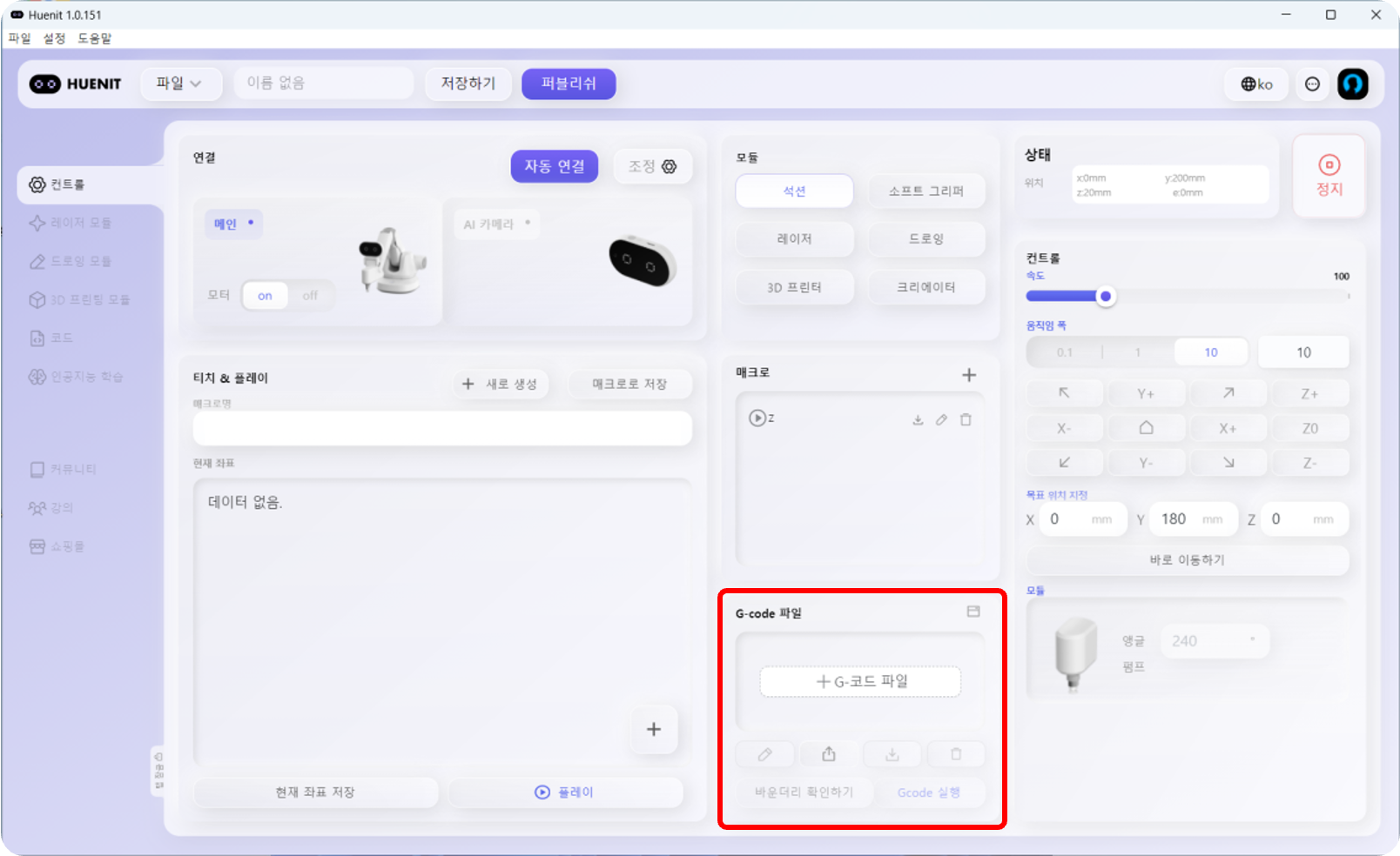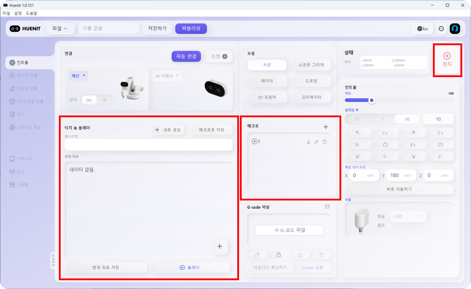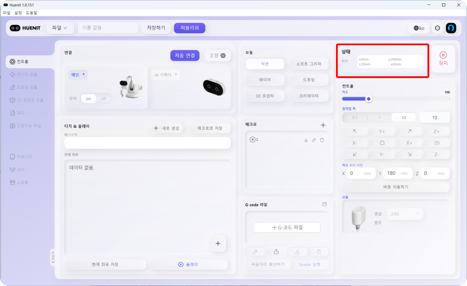 <mark style="color:purple;">**\[컨트롤]**</mark> 탭에서는 코딩없이 로봇팔을 제어할 수 있다. 현재 로봇팔의 위치(X, Y, Z좌표)도 확인하면서 제어할 수 있어 HUENIT OS보다 정확한 로봇 제어가 가능하다.&#x20;