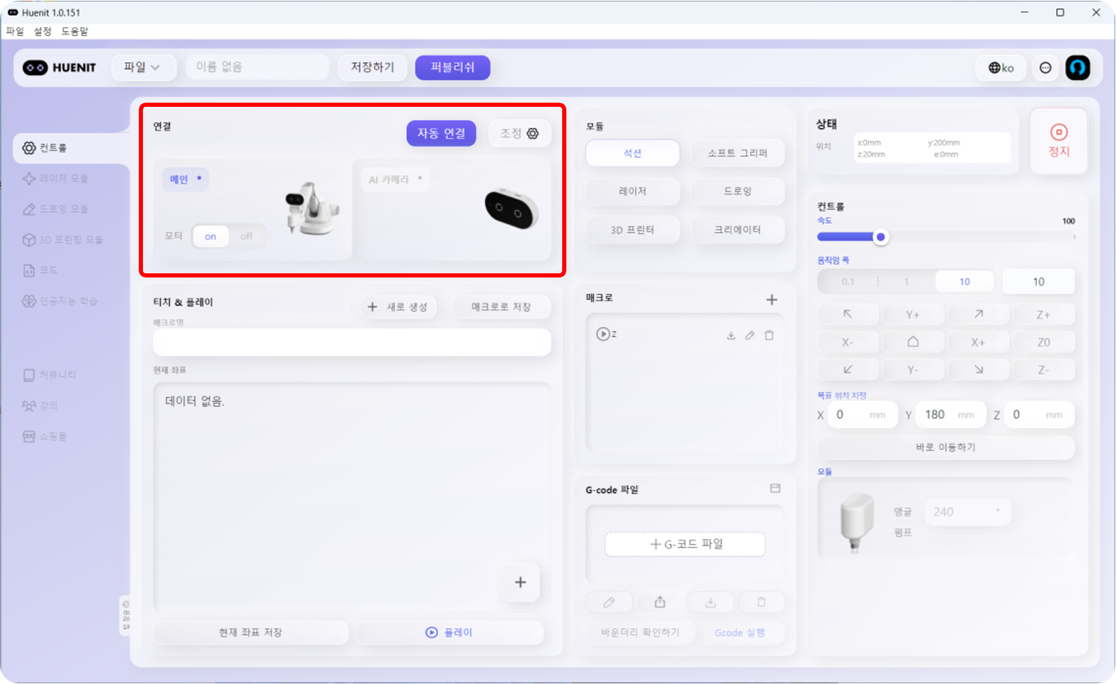 로봇팔을 제어하기 위해서는 HUENIT LAB에 로봇팔이 연결되어 있어야 한다. <mark style="background-color:purple;">**자동연결 기능**</mark>을 통해 HUENIT 로봇팔 또는 AI 카메라를 연결할 수 있다. 또한, 현재 연결된 장치가 무엇인지도 확인 가능하다. (AI 카메라의 연결상태 및 자동연결 또한 \[컨트롤]탭에서 가능하지만, AI 카메라를 제어할 수 있는 기능은 없다.)