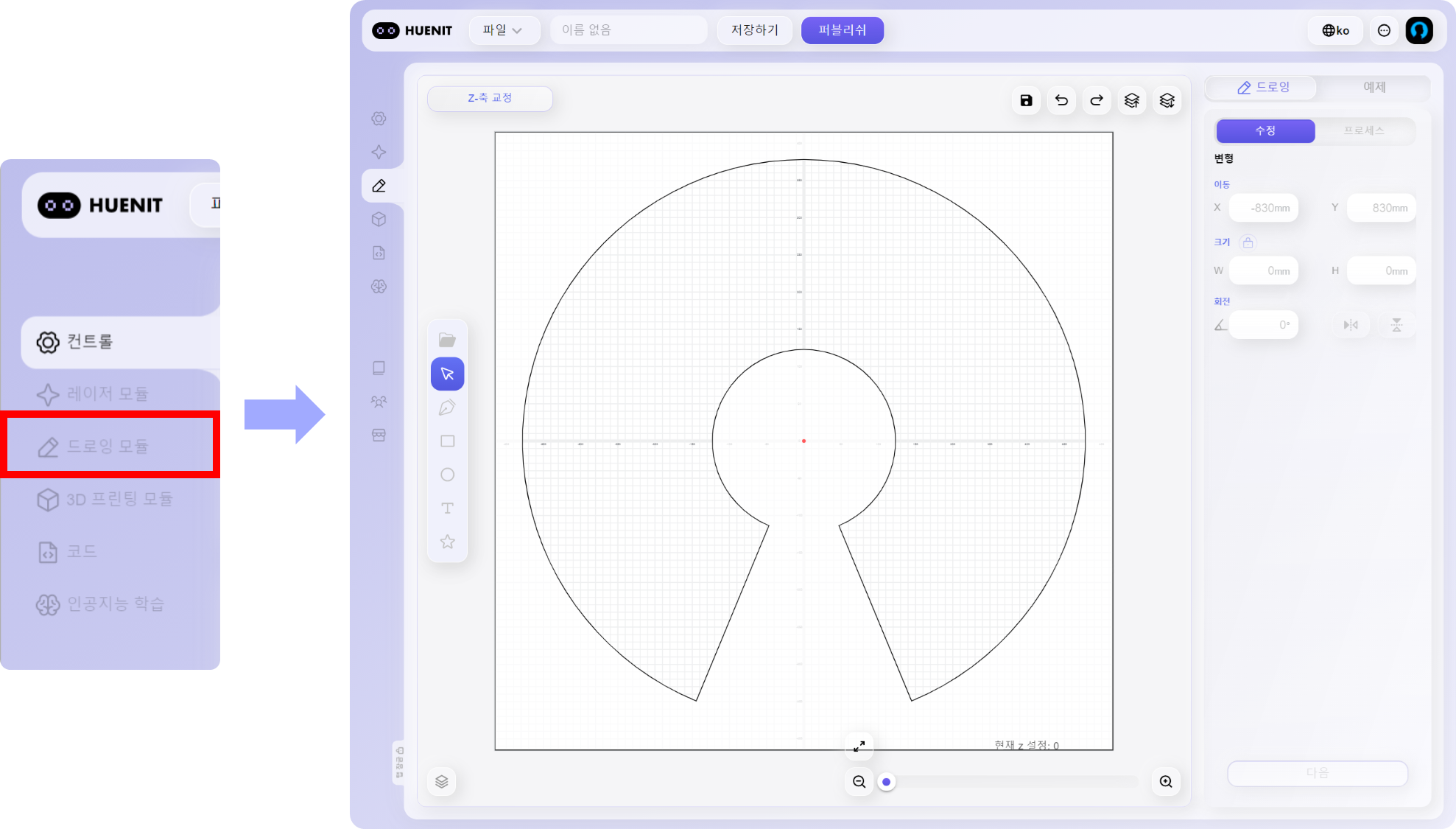 1. [**펜 높이 설정(Z축 교정)**](https://huenit.gitbook.io/huenit-edu/huenit/huenit-lab/3./3.1-z) - 펜이 작업 표면에 정확히 닿도록 Z 높이를 조정합니다.