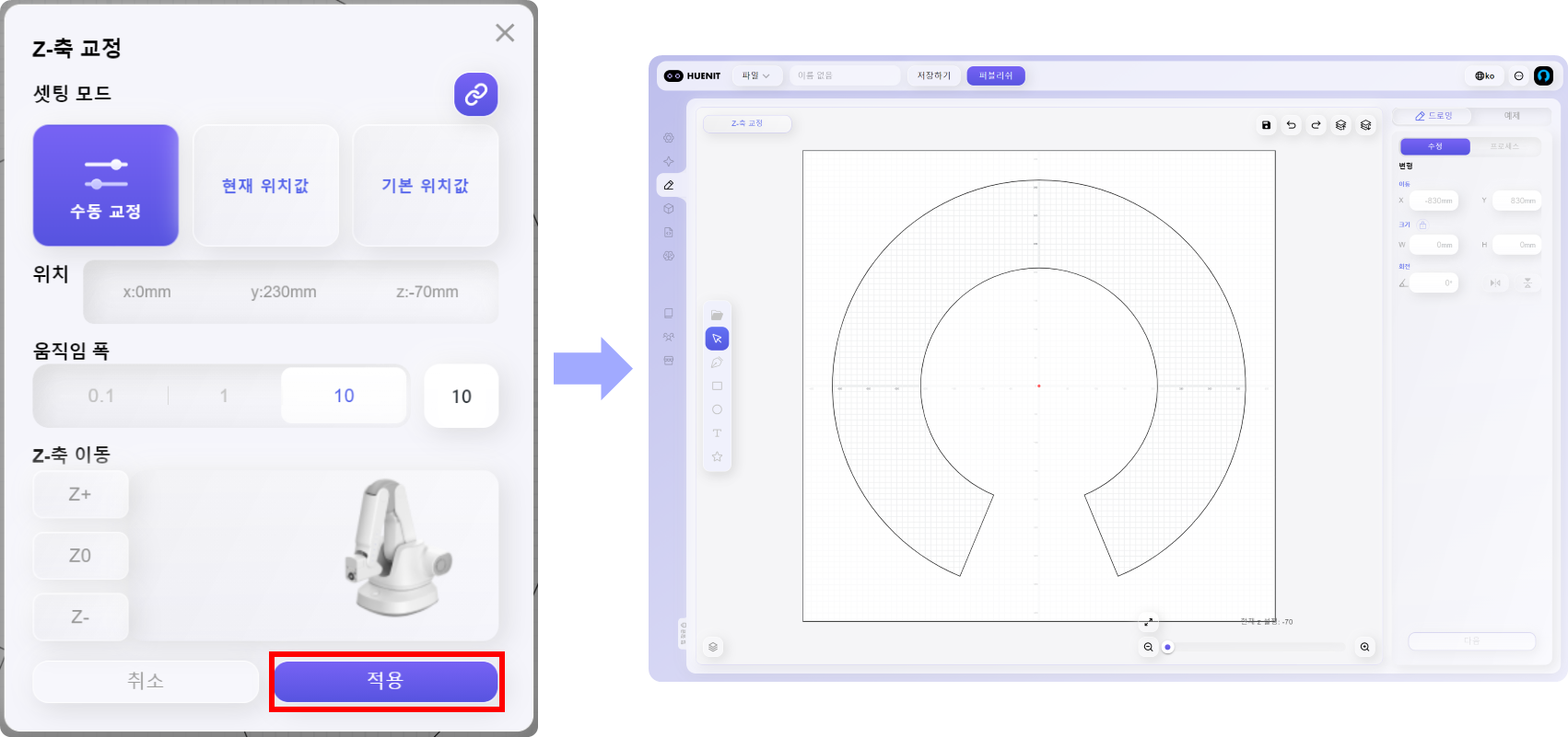 HUENIT 로봇팔이 연결된 경우에만 수동 교정을 통해 Z축을 설정할 수 있습니다.