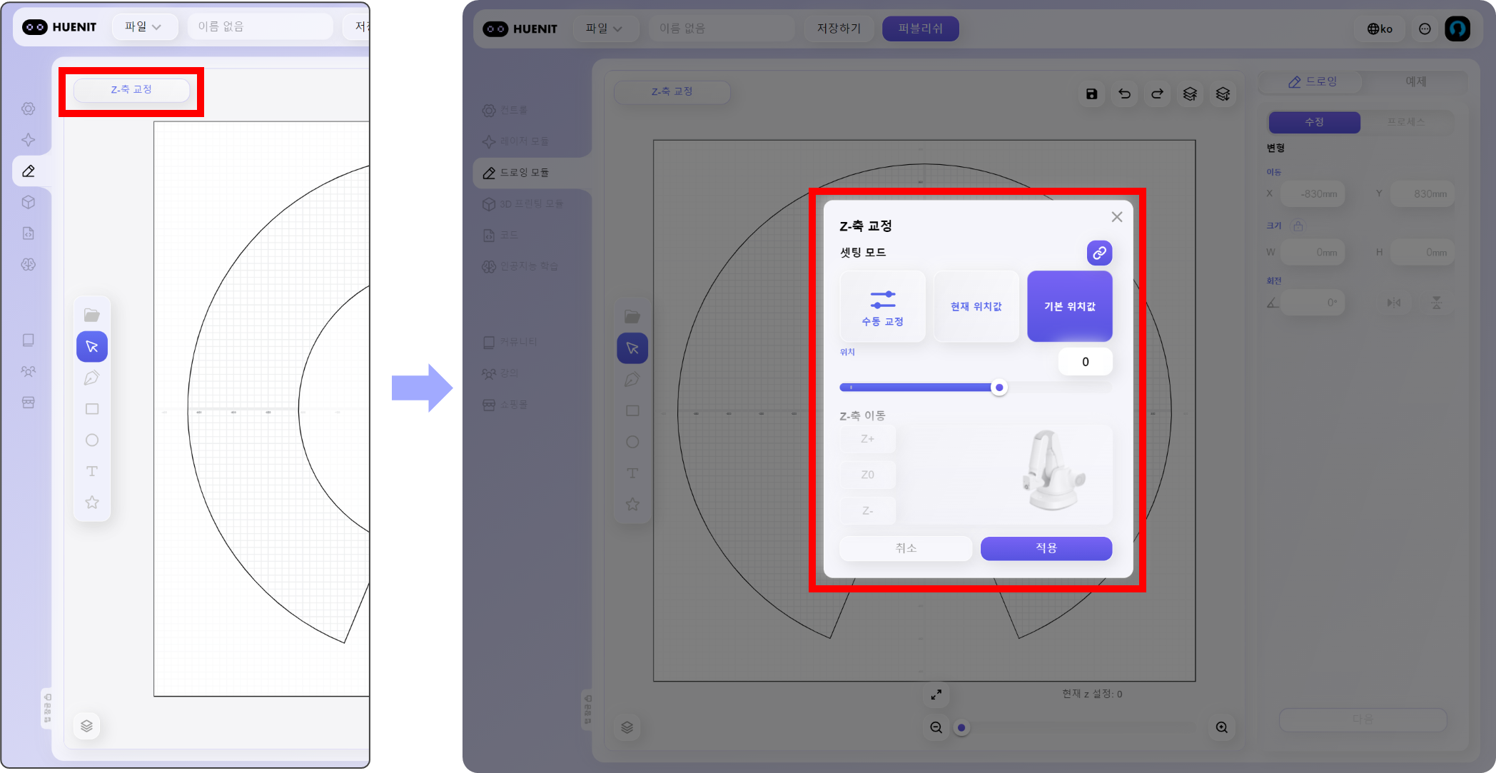 Z축 교정 팝업은 \[드로잉] 탭에 처음 진입할 때 자동으로 표시됩니다. 만약 팝업을 닫았다면, 드로잉 인터페이스의 좌측 상단에 있는 **\[Z축 교정] 버튼**을 눌러 다시 열 수 있습니다.