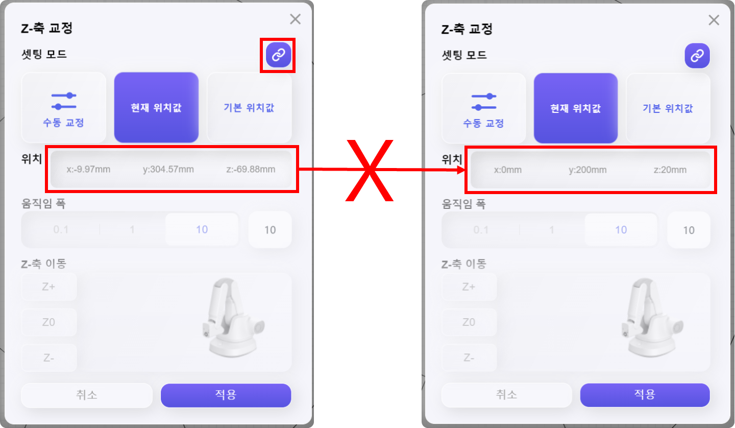 \[자동연결**🔗**] 버튼을  누르면, 로봇팔이X:0, Y:200, Z:20 위치로 이동하게 되어, <mark style="color:red;">**현재 위치의 Z좌표로 Z축 교정을 진행할 수 없습니다.**</mark>