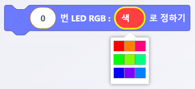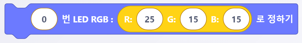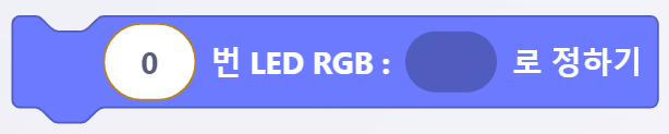 <figure><img src="https://3075547475-files.gitbook.io/~/files/v0/b/gitbook-x-prod.appspot.com/o/spaces%2FmpoZH5TMk0ougpcCYECz%2Fuploads%2FMKE7rWUzVR9wyBEk3Io8%2Fimage.png?alt=media&#x26;token=7b645d15-0308-4bb1-a756-00cbe7d6f146" alt=""><figcaption><p>[ ( )번 LED RGB : ( )로 정하기] 블록</p></figcaption></figure>