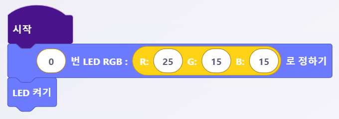 <figure><img src="https://3075547475-files.gitbook.io/~/files/v0/b/gitbook-x-prod.appspot.com/o/spaces%2FmpoZH5TMk0ougpcCYECz%2Fuploads%2Fk3z0qvSLLSiLE1r8Honb%2Fimage.png?alt=media&#x26;token=cf96a2a1-b229-4581-9bfd-71cbbf7b1993" alt=""><figcaption><p>[ LED 켜기 ] 블록</p></figcaption></figure>