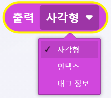 드롭다운 형태의 **\[출력]** 블록은 선택한 인공지능 모델에 따라 드롭다운 항목이 달라집니다. \[태그 인식] 모델에는 사각형, 인덱스, 태그정보가 제공됩니다.