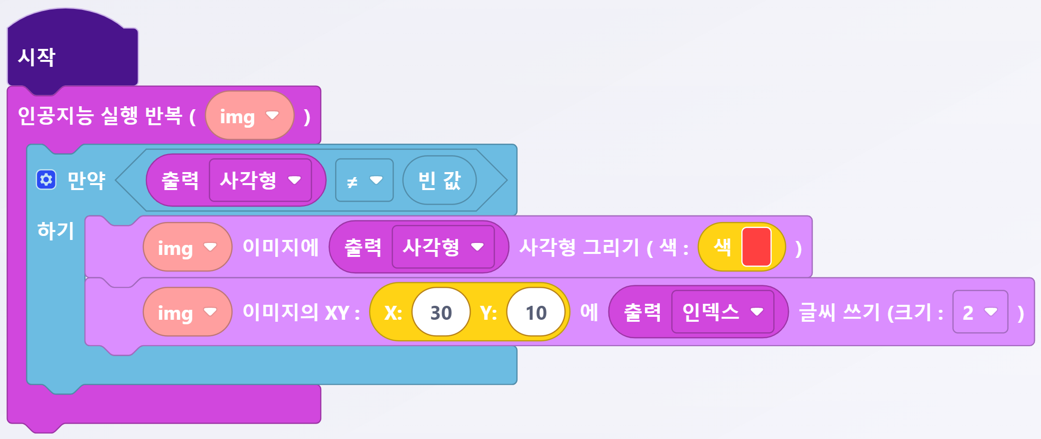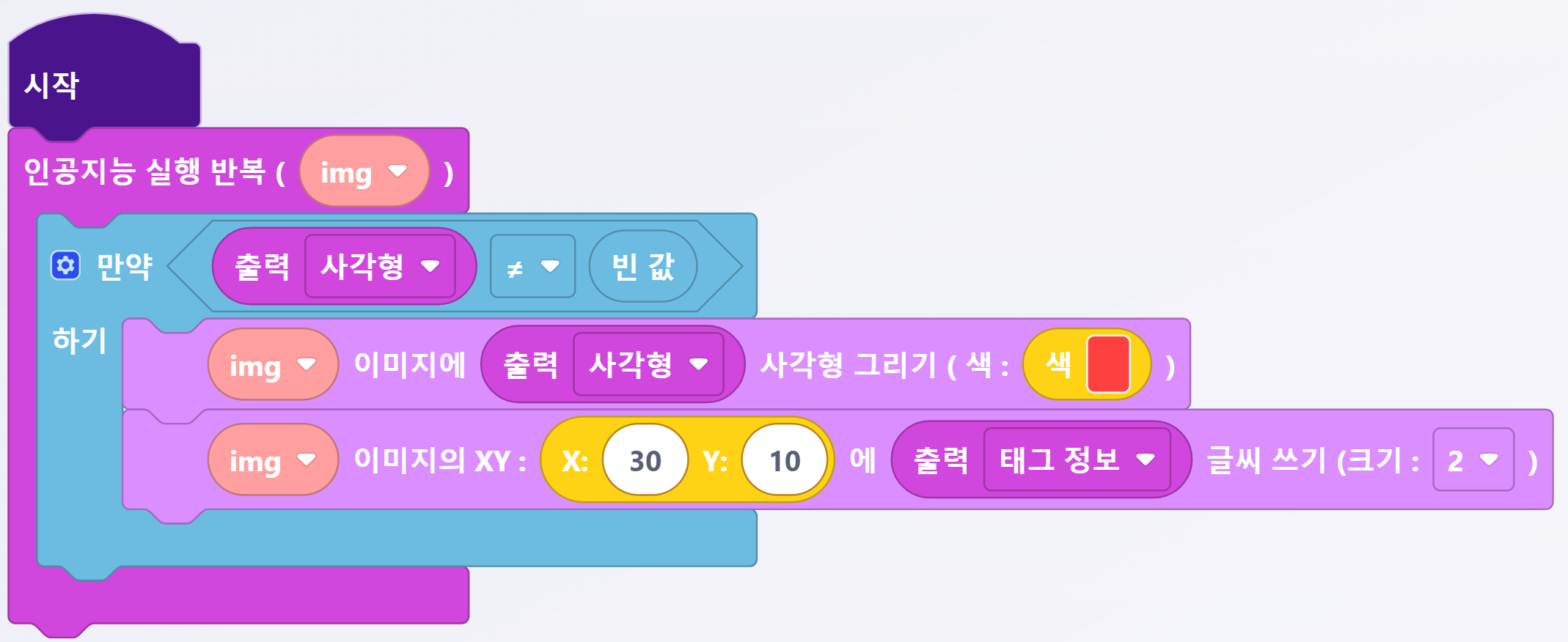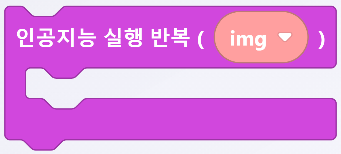 <figure><img src="https://3075547475-files.gitbook.io/~/files/v0/b/gitbook-x-prod.appspot.com/o/spaces%2FmpoZH5TMk0ougpcCYECz%2Fuploads%2FQ8PQGYnikshGgMFT0iHi%2Fimage.png?alt=media&#x26;token=51990ef0-c6e2-4d2e-84aa-fab34b1d31bd" alt="" width="375"><figcaption><p>[인공지능 실행 반복(img)] 블록</p></figcaption></figure>