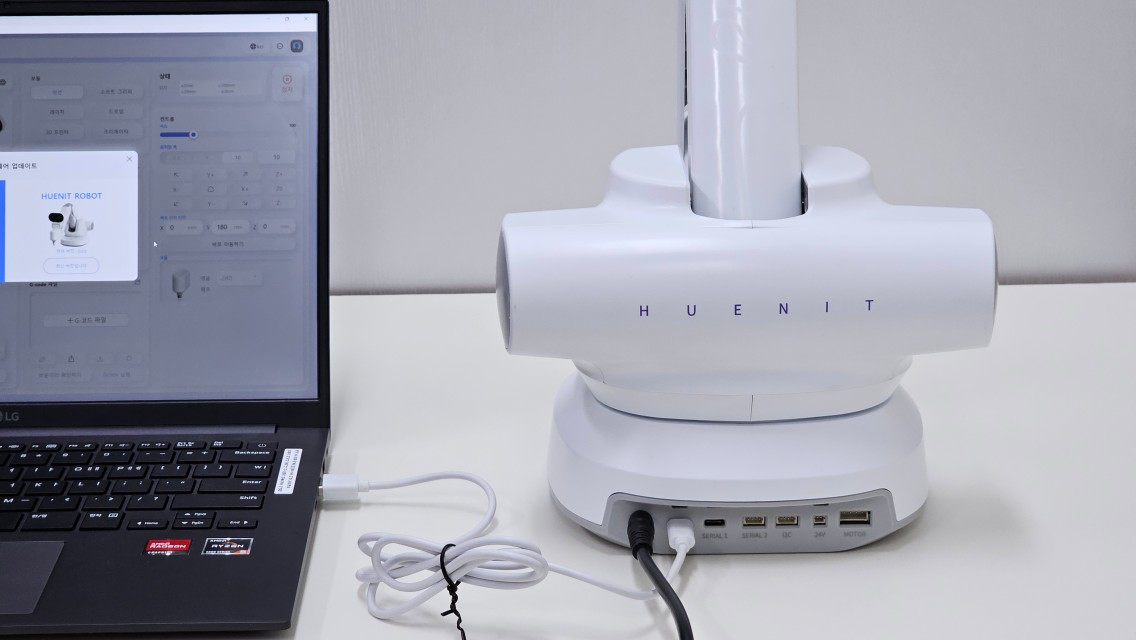 로봇팔의 **PC 전용 포트(C타입)**&#xB97C; 이용해, 아래 그림과 같이 PC와 연결합니다.
