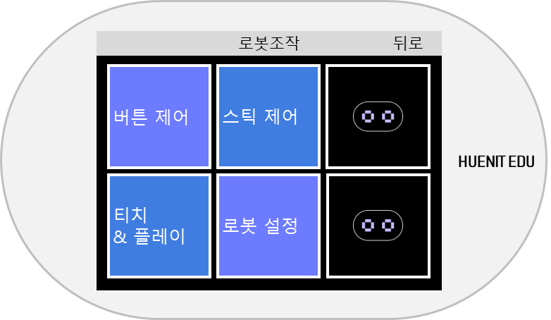 HUENIT OS의 초기화면에서 <mark style="background-color:purple;">**\[로봇  조작]**</mark> 메뉴에 진입하면 다음과 같이 총 4개의 버튼이 있습니다: